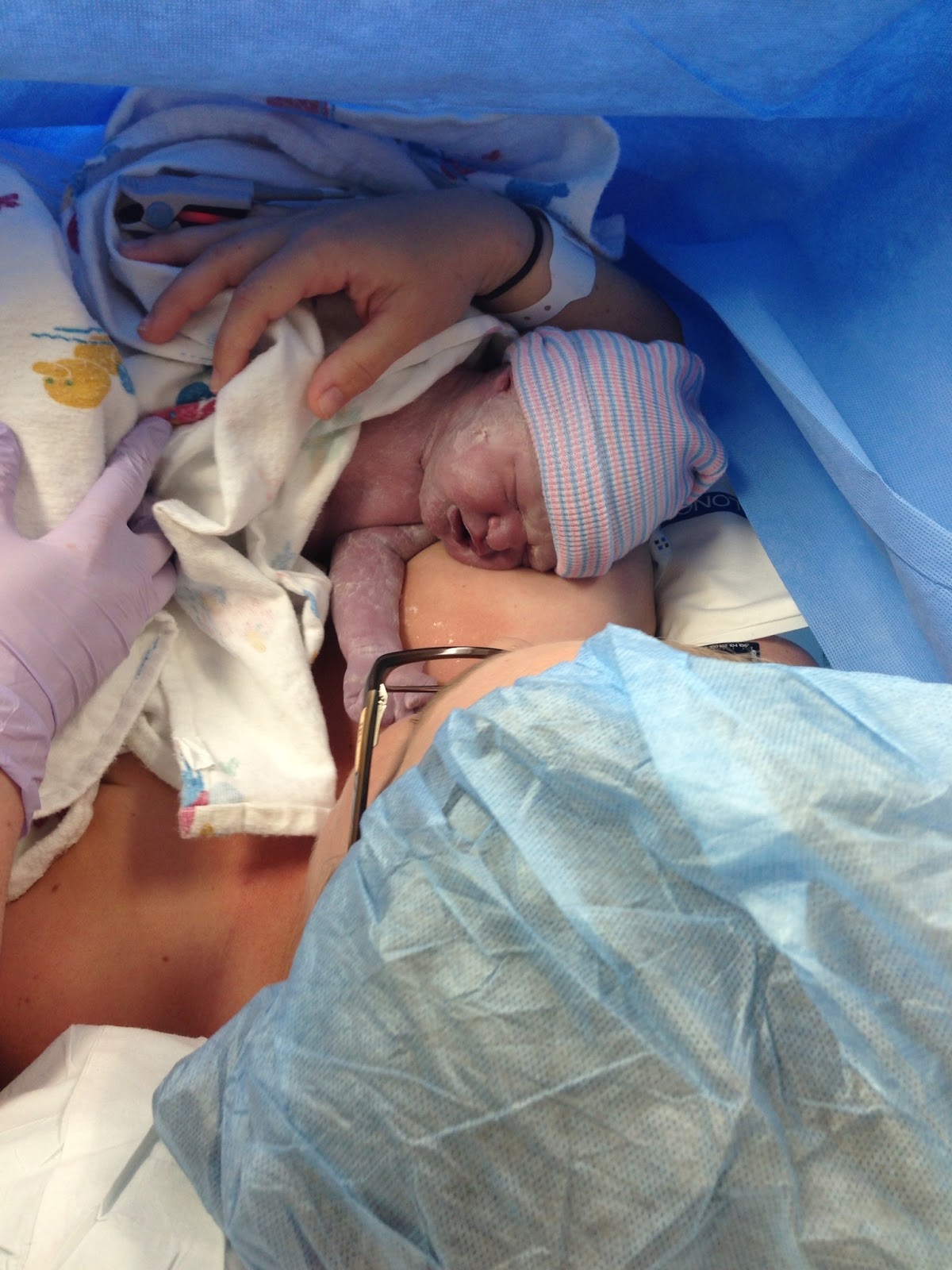 They called my Wife back in the room. My OB had come around by my head and held a towel clip and said did you feel that? I replied no and he informed me how he pinch my belly to make sure I was numb. I had worried about that!! I heard the start time was 12:14 and I could hear the bovie cutting my skin. I started feeling a pressure from the OB's hands in my abdomen. Then I heard him say "what in the world? so much for being in the pelvis!" He said "Your baby has gone transverse on me". Then he told me I was going to feel a lot of pressure and to just hang tight. The first assistant was mashing on my left side and I heard each of them grunting a bit. My Wife said I was jostled all over the table. I finally heard a waaaaaaa-waaaaa cry and my OB held our sweet baby girl over my face. She had a few drops of bloody liquid that fell on my face but I didn't care. They squeezed the blood towards her body and cut the cord and placed her on my chest. She had vernix all over her sweet self. It felt SO soft on my chest. They began to assess her and decided after a minute or two that she needed to be under a little oxygen. She was under the warmer with my Wife for what seemed like forever. I know my nurse had told the nurse who came into the room to take care of baby Girl how important skin to skin was so when she took her to the warmer she kept telling me how sorry she was and how she would try to get her back to me ASAP. After several minutes of assessment the nurse said she needed to take baby Girl to transition to monitor her O2 and they would get her back to me as soon as they could. My Wife could accompany her and I was SO thankful for that.